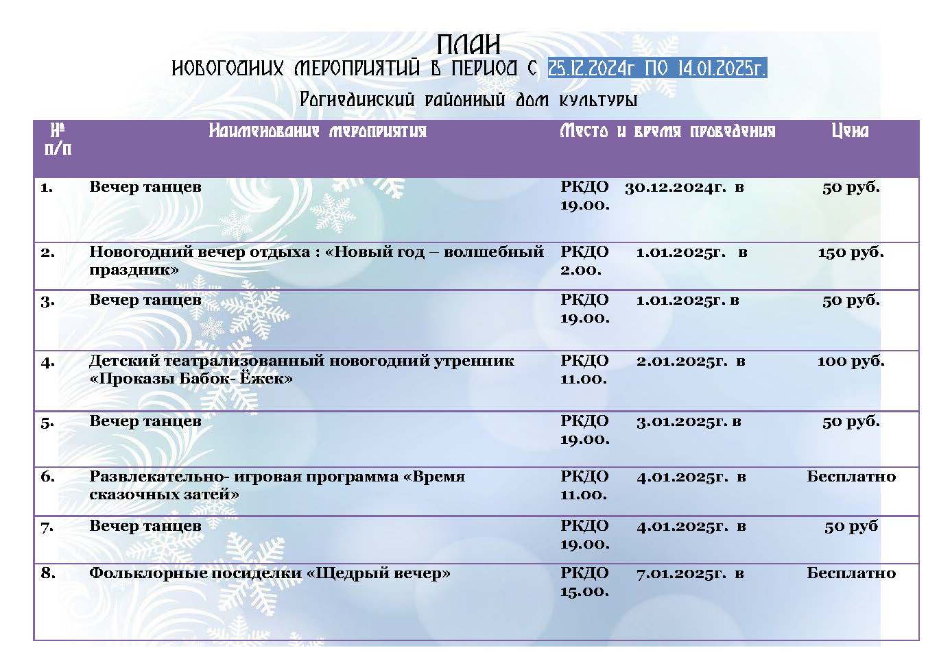 План новогодних мероприятий Рогнединского ДК с ценами
